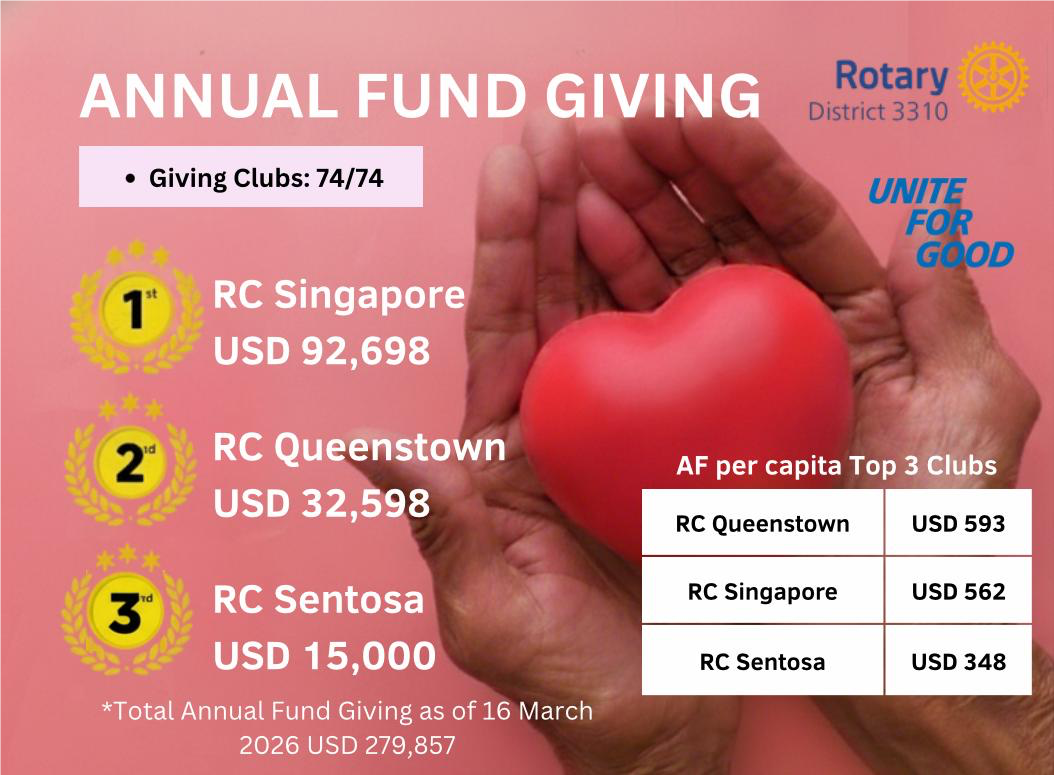 District 3310 has achieved full participation in Annual Fund giving this year, with all 74 clubs contributing. As of 16 March 2026, total giving stands at USD 279,857, reflecting a strong collective commitment across the district.