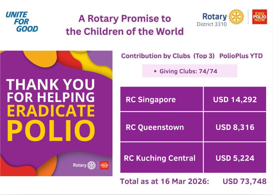 District 3310 continues to demonstrate strong commitment to the global effort to eradicate polio. All 74 clubs in the district have contributed to PolioPlus this year, reflecting full participation across the network.