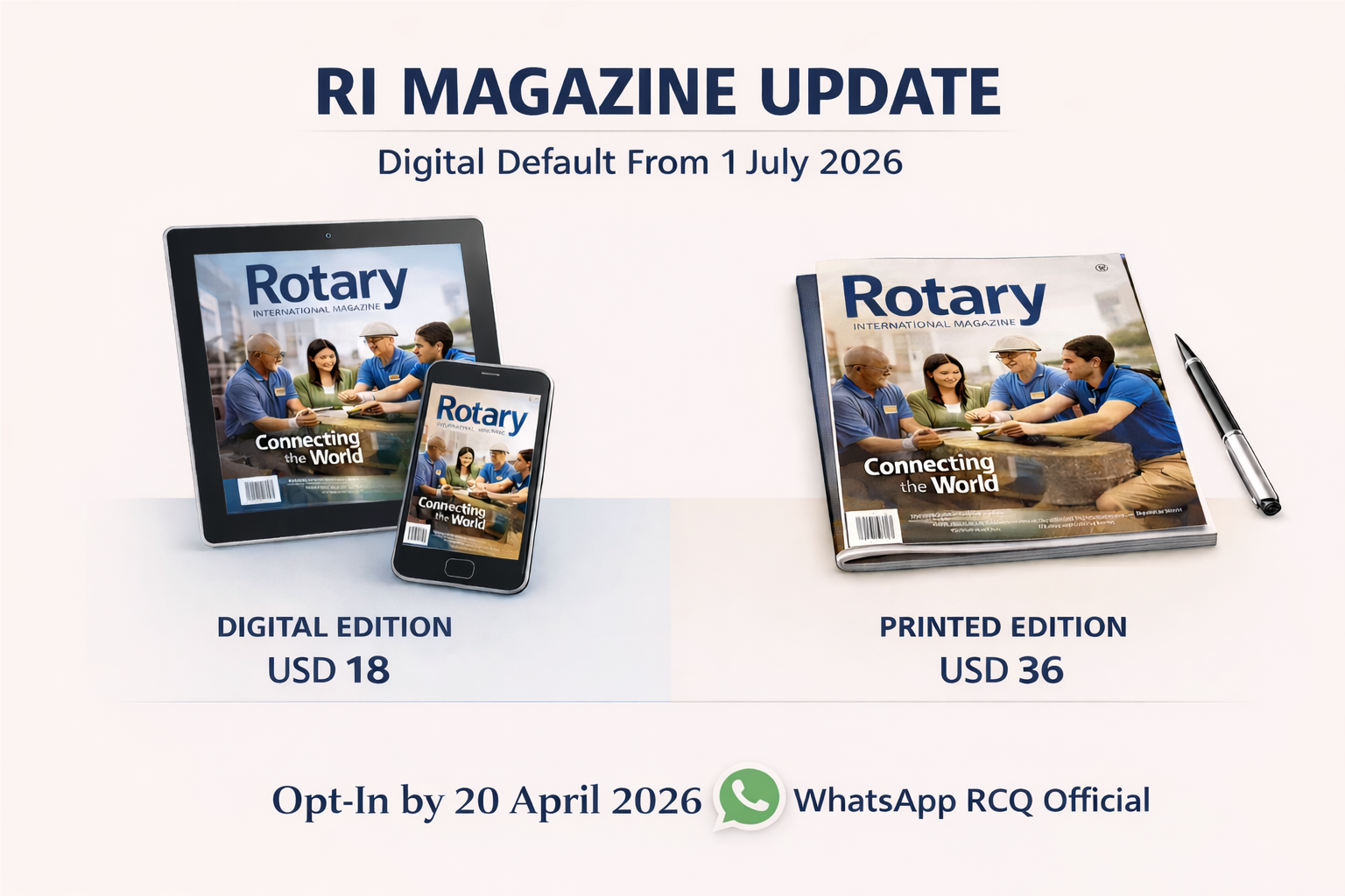 Following a WhatsApp poll on 21 January 2026, the Board has resolved that the Rotary International Magazine will default to the digital edition (USD 18) from 1 July 2026.