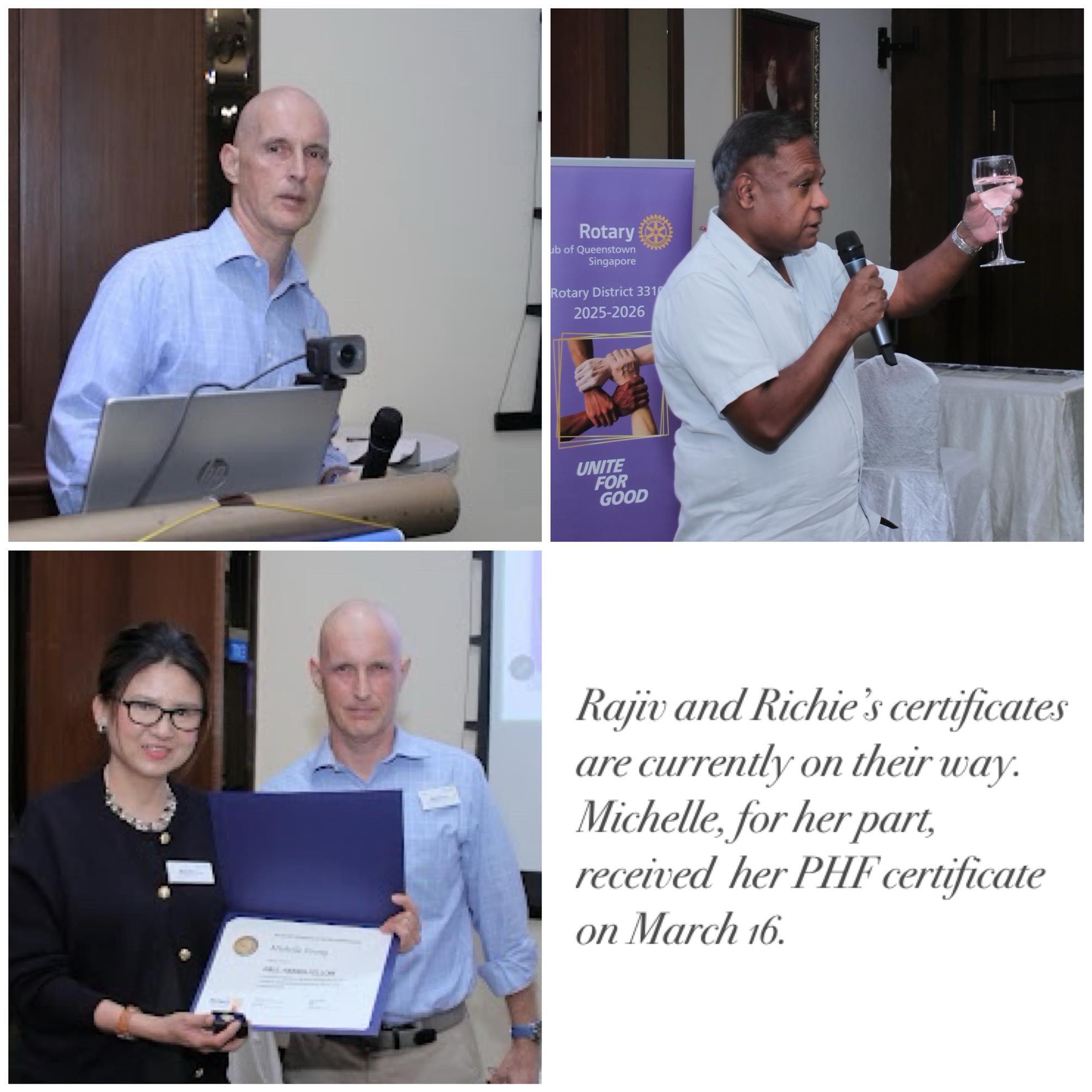 Rtn Richie was presented with his PHF certificate, while PP Denis celebrated an impressive milestone with the upgrade of his PHF recognition to Level six.